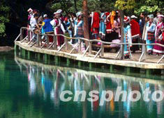四川省馳名中外的九寨溝風(fēng)景旅游地,今年春天在抗擊SARS病毒的大戰(zhàn)中雖然游客銳減,但成功拒病毒于千里之外。如今八月之夏,九寨溝的青山綠水邊又成為千上萬中外游客的最佳選擇。中新社記者:賈國榮