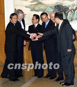 中國代表團團長、外交部副部長王毅在釣魚臺國賓館迎候各國團長,會談比預定的九點稍晚了幾分鐘。會談開始前,六方代表團團長在釣魚臺芳菲苑大廳合影,隨后步入會談現(xiàn)場。據本社記者現(xiàn)場觀察,六條長桌首尾相接,圍成一個六角大桌,六國代表團圍著六角大桌落座。(完)