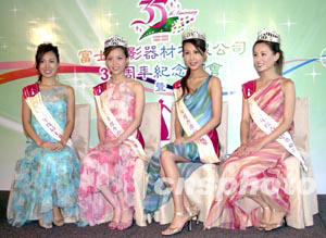 應屆出爐港姐冠軍曹敏莉(右二)、亞軍楊洛婷(右一)、季軍戚黛黛(左二)、最上鏡小姐及卓越才藝小姐兩個獎項的李詩韻(左一)8月29日在香港出席贊助商富士攝影器材有限公司頒贈獎品儀式。中新社記者:鄧慶樂