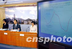 香港政府經(jīng)濟顧問鄧廣堯,8月29日就2003年第二季經(jīng)濟報告及2003年本地生產(chǎn)總值和物價預測舉行記者會,受SARS影響,今年第二季香港經(jīng)濟錄得負增長0.5%。不過,港府將全年經(jīng)濟增長預測,由1.5%調升至2%。中新社記者:洪少葵