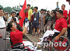 9月2日上午,第六屆中國殘疾人運動會火炬?zhèn)鬟f起跑儀式在南京市白馬公園舉行。圖為徐州籍運動員張靜從張海東手中接過火炬,開始進行火炬?zhèn)鬟f。作者:丁東升