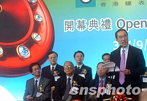 亞洲最大型的鐘表展“香港鐘表展2003”,九月三日在香港會展中心揭幕,來自世界各國及內(nèi)地、香港的七百多家參展商參展。圖為香港財政司司長唐英年在開幕式上致辭。中新社記者:錢興強(qiáng)