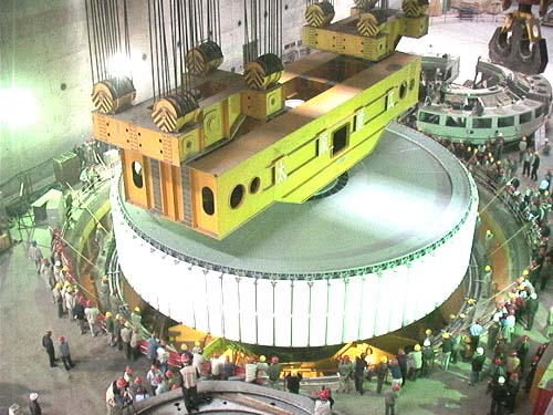 中新網(wǎng)9月6日電 重達(dá)1780噸的三峽左岸電站4號(hào)機(jī)組轉(zhuǎn)子今天順利吊裝就位。