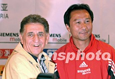 九月八日下午,即將參加十日舉行的雅典奧運(yùn)會(huì)足球預(yù)選賽的中國U23隊(duì)(國奧隊(duì))主教練沈祥福(右)和敘利亞隊(duì)主教練沙馬斯(左)在昆明舉行聯(lián)合記者會(huì)。中新社記者:張煒