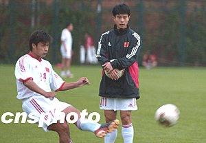 九月八日傍晚,中國U23足球隊(國奧隊)球員在昆明紅塔足球基地加緊訓練定位球。十日晚,雅典奧運會足球預選賽中國U23足球隊與敘利亞U23隊的比賽將在昆明拓東體育場進行。中新社記者:張煒