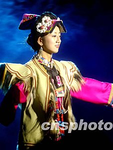 四川省九寨溝民族藝術(shù)團(tuán)如今每天為當(dāng)?shù)刂型庥慰团e行篝火晚會(huì),羌族姑娘展示昔日游牧生活的服飾,漂亮而實(shí)用。中新社記者:賈國(guó)榮