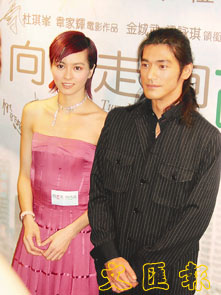 金城武與梁詠琪坐著勞斯萊斯抵達(dá)戲院,兩人手拖著手進(jìn)場(chǎng),之后又手挽著手給傳媒拍照,梁詠琪以一身紫粉紅色Christain Dior連身裙及紅鞋,再配以鉆石頸煉及手表盛裝出現(xiàn),非常迷人,相反阿武只是簡(jiǎn)單的黑恤衫,倒感平凡。
