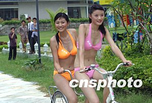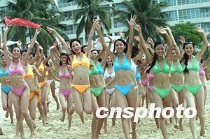 經過幾天在海南三亞的賽前培訓,九月十日,參加2003年新絲路中國模特大賽的五十一名佳麗到海灘上放松心情,舒緩大賽前的緊張氣氛。中新社記者:盛佳鵬