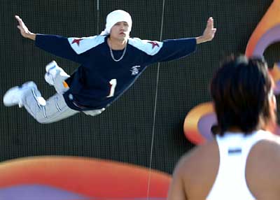 盡管已經(jīng)到了秋高氣爽的天氣,但是昨天下午的太陽依然跟人較勁。工人體育場上,又出現(xiàn)了和上周一樣的場景——一個是已見雛形的景觀歌劇《阿依達》的巨型金字塔舞臺,另一個就是明天將要在這里上演的周杰倫個人演唱會的豪華舞臺。陽光暴曬下,工作人員正在緊張地忙碌著。舞臺上方,一個籃球架已經(jīng)安置完畢,屆時它將從上方緩緩降落為小天王支起一個臨時的籃球場,周杰倫將為現(xiàn)場觀眾展示高超的球技。記者看到舞臺上有7個快速升降機,到時候周杰倫可以隨時從舞臺的某一個地方“冒”出來,讓觀眾大吃一驚。下午3:00,頭上包著白色毛巾的周杰倫出現(xiàn)在舞臺上,小天王這個打扮讓記者想到了陜西頭戴白羊肚毛巾的農(nóng)民。因為在晚會上有“從天而降”的飛行動作,所以主辦方要求他先演習(xí)一下,以保證演出萬無一失。周杰倫在工作人員的幫助下系上安全帶,將鋼絲“拴”在腰間。在倒數(shù)“1、2、3”之后,站在臺階上的周杰倫騰空而起然后緩緩落在舞臺前方?罩械闹芙軅悇幼鲀(yōu)美干凈利落,贏得周圍一片掌聲。很少有笑模樣的小天王,這時臉上也不由自主地流露出幾許得意。在周杰倫玩“飛人游戲”的過程中,他的兩個壯碩的黑人保鏢就目不轉(zhuǎn)睛地站在舞臺上。(張學(xué)軍)