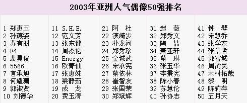 據(jù)聯(lián)合早報報道,“2003年亞洲人氣偶像50強”投選范圍包括從事演藝、歌唱、體育、模特兒及服裝界的亞洲人士。經(jīng)過5周熱烈的投票,吸引將近7萬張選票。