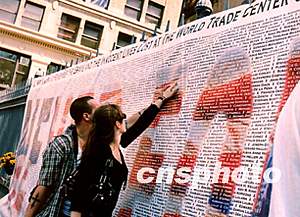 美東時(shí)間九月十一日,數(shù)以千計(jì)的普通市民前往紐約世貿(mào)中心廢墟遺址,憑吊兩年前“九一一”恐怖襲擊事件中的遇害者。圖為遇害者親屬撫摸鐫刻在大理石墻上的親人的名字。作者:龔文謨