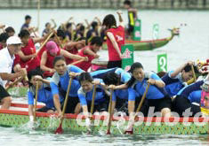 2003年亞太城市龍舟邀請賽決賽及小龍公開賽決賽十四日在澳門西彎人工湖舉行,參賽各隊競爭激烈,盡顯巾幗不讓須眉之本色。中新社記者:李剛