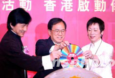 香港旅游發(fā)展局9月15日推出全新的「香港-樂在此,愛在此!」全球廣告宣傳活動(dòng),政務(wù)司長(zhǎng)曾蔭權(quán)[中]、旅游發(fā)展局主席周梁淑怡[右]及香港旅游大使成龍出席主持啟動(dòng)儀式。作者:洪少葵