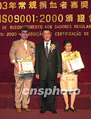 今日還同時舉行了澳門捐血中心獲得ISO九00一:二000質量認證頒證儀式,國家認證認可監(jiān)督管理委員會主任王鳳清專程前來頒發(fā)證書并致辭祝賀。