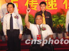 圖:鄧樸方為中國殘運會火炬?zhèn)鬟f鳴槍