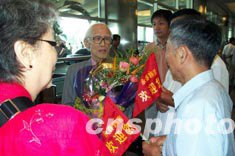 臺(tái)灣著名詩(shī)人余光中伉儷9月16日下午抵廈門(mén)機(jī)場(chǎng),受到鄉(xiāng)親的熱烈歡迎。。余光中的祖籍在泉州市永春縣,這是他第一次“原鄉(xiāng)行”。作者:鄭祚聲