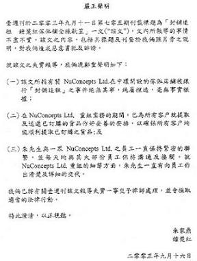 (一)該文所指有關(guān)NuConcepts Ltd.在中環(huán)開設(shè)的家俬店鋪被銀行“封鋪追租”之事件絕無其事,純屬捏造,毫無事實根據(jù);(二)在NuConcepts Ltd.重組業(yè)務(wù)的期間,已為所有客戶就提取及送遞已訂購的貨品作好妥善的安排,以確保所有客戶均能順利提取已訂購之貨品;(三)朱先生與一眾NuConcepts Ltd.之員工一直保持緊密的聯(lián)系,并每天均與其大部分員工保持溝通及接觸。就NuConcepts Ltd.重組的細節(jié)方面,朱先生一直有向員工作出清楚及詳細的交代。