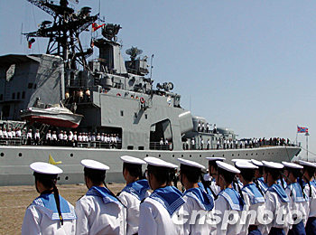 9月20日,俄羅斯海軍“潘捷列耶夫海軍上將”號(hào)大型反潛艦,在太平洋艦隊(duì)副司令科涅夫·亞歷山大·瓦西里耶維奇中將率領(lǐng)下抵達(dá)青島港。圖為歡迎俄艦來(lái)訪的中國(guó)海軍官兵。鄒山 攝