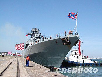 9月20日,俄羅斯海軍“潘捷列耶夫海軍上將”號(hào)大型反潛艦,在太平洋艦隊(duì)副司令科涅夫·亞歷山大·瓦西里耶維奇中將率領(lǐng)下,抵達(dá)青島港。鄒山 攝