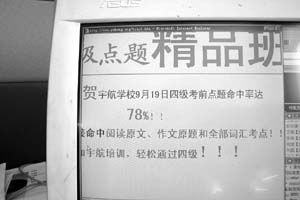 據(jù)《京華時(shí)報(bào)》報(bào)道,北京某高校剛剛參加完英語(yǔ)四級(jí)考試的小鮑反映,前天,不少同學(xué)在地質(zhì)大學(xué)看到當(dāng)晚在該校將舉行“四級(jí)考試考前點(diǎn)題培訓(xùn)”的海報(bào),入場(chǎng)券50元,舉辦方為北京宇航考試培訓(xùn)學(xué)校。“這次培訓(xùn)點(diǎn)中了試題中大概50分的內(nèi)容!”