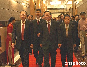 國(guó)務(wù)委員唐家璇(中)在國(guó)務(wù)院僑辦副主任、中新社社長(zhǎng)劉澤彭(左),湖南省委副書記、代省長(zhǎng)周伯華(右)等陪同下,二十一日在長(zhǎng)沙出席“第二屆世界華文傳媒論壇”晚宴。中新社記者:武仲林