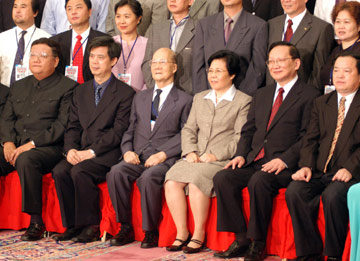國(guó)務(wù)委員唐家璇(右二)二十一日接見“第二屆世界華文傳媒論壇”與會(huì)代表并合影留念。中新社 張宇 攝