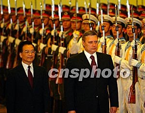 中新網(wǎng)9月24日電 國務(wù)院總理溫家寶今天上午在人民大會堂北大廳主持儀式,歡迎出席完上海合作組織成員國總理第二次會晤的俄羅斯聯(lián)邦政府總理卡西亞諾夫正式訪華。