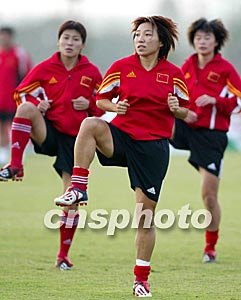 美國當?shù)貢r間9月24日晚6點,參加2003女足世界杯的中國隊在美國洛杉磯南部卡森的The Home Depot Center體育場的1號場地進行了小組賽第二場比賽前的最后一次訓練。女足姑娘們在孫雯的帶領下做訓練前的準備活動。作者:劉占坤