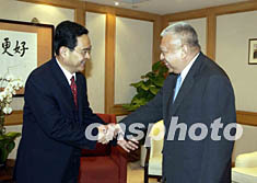 香港行政長官董建華(右)九月二十六日在辦公室會見到訪的河北省省長季允石,雙方就加強兩地的經(jīng)貿合作交換意見。中新社圖