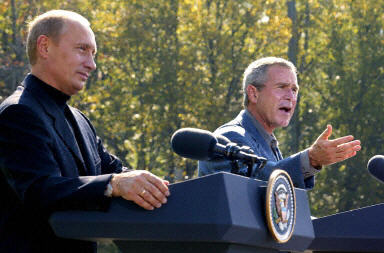 美國總統(tǒng)布什與俄羅斯總統(tǒng)普京27日舉行了會(huì)談。在會(huì)談后的一個(gè)新聞會(huì)上,兩國領(lǐng)袖呼吁朝鮮停止他們的被認(rèn)為是核武發(fā)展計(jì)劃的項(xiàng)目,敦促伊朗與國際原子能機(jī)構(gòu)合作。