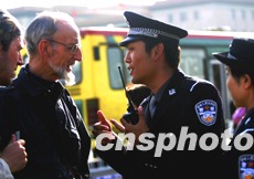 參加國(guó)慶值勤的北京警察學(xué)院學(xué)員,四日在天安門廣場(chǎng)為外國(guó)游人解答問題。“十一”期間首都警方加大了旅游景區(qū)的值勤力量,以確保游客安全。中新社記者:宋吉河