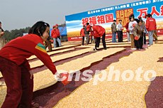 “十一國慶節(jié)”假日,在北京地壇公園舉辦的2003年北京書市上,《北京青年報》社在地壇祭壇400平米臺上,舉行《祝福祖國》萬人拼圖暨發(fā)行宣傳周活動,吸引數(shù)以千計民眾參與。她們將玉米、紅豆、黃豆、綠豆等五谷雜糧灑下,鋪成巨大的“祝福祖國”詞組,愿祖國大地五谷豐登。中新社記者:鄒憲