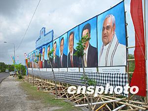 東盟系列峰會(huì)將于七日在印尼旅游勝地巴厘島揭幕,溫家寶等十四個(gè)與會(huì)國(guó)家領(lǐng)導(dǎo)人的巨幅頭像懸掛于道路兩旁。中新社記者 齊彬 攝