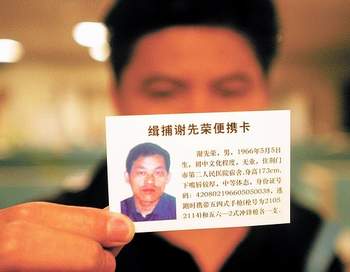 這張卡片名為“緝捕謝先榮便攜卡”,正面左邊為謝先榮的彩色頭像,右邊則是簡(jiǎn)介:謝先榮,男,1966年5月5日生,初中文化程度,無業(yè),住荊門市第二人民醫(yī)院宿舍,身高173厘米,下嘴唇較厚,中等體態(tài),身份證號(hào)碼:420802196605050038,逃跑時(shí)攜帶五四式手槍和五六-2式?jīng)_鋒槍各一支。