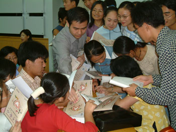 演講結(jié)束后,采訪團(tuán)向合工大贈(zèng)送了來(lái)自民間的思悟錄——〈牽手愛(ài)心〉,大學(xué)生們將“愛(ài)心之旅”成員周永琴、趙玉芝、宋體金、李繁民團(tuán)團(tuán)圍住,請(qǐng)他們簽字留念。(華夏時(shí)報(bào)圖 大漠?dāng)z)