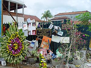 據(jù)介紹,巴厘島當局原打算在這塊空地上建一座紀念碑,但因有爭議,被擱置了下來。在街道左邊的小三角形地段,建筑工人正在鋪設路面。對面一座新商店已開始營業(yè),臨近的“泛印尼銀行”還修筑了一道新圍墻,樓頂加蓋了藍瓦新頂。除了這塊尚不知作何用途的空地以外,爆炸案現(xiàn)場已漸漸和庫塔街融為一體。