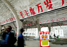 照片和裝置藝術(shù),配上陳舊的機(jī)床與剝落的標(biāo)語(yǔ),由五十年代舊廠房改建的“798藝術(shù)新區(qū)”成為北京黃金周的新旅游熱點(diǎn)。中新社記者:鄭萍萍