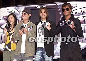 諾基亞N-Gage手提游戲機10月7日在香港舉行推廣活動,大會特別邀請演藝界喜好“打機一族”古天樂、馮德倫、余文樂、李蘢怡(右起)出席活動,諾基亞N-Gage除具備三頻通訊功能外,更有流動游戲機功能。作者:鄧慶樂
