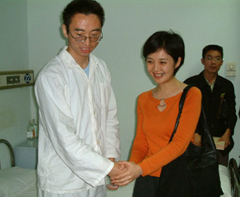 9月26日,鳳凰衛(wèi)視知名女主播、“華夏愛心團(tuán)愛心專員”許戈輝,手捧鮮花,來到空總血液科病房慰問身患MDS骨髓增生異常綜合癥的貧困大學(xué)生干海濤,并現(xiàn)場(chǎng)捐贈(zèng)一萬元。北京太陽宮房地產(chǎn)有限公司總經(jīng)理韓國(guó)建也代表華夏愛心團(tuán)捐助了現(xiàn)款,并邀請(qǐng)海濤在“牽手愛心墻”的采集印上按下了自己的手印。