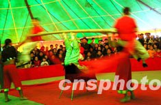 “十一”長假期間,許多游客來到雜技之鄉(xiāng)河北吳橋一睹雜技風(fēng)采。這里除了傳統(tǒng)的吳橋雜技外,還增加許多新組合的節(jié)目。圖中利用云貴民族舞蹈中的細節(jié)與雜技蹬凳結(jié)合編排的表演,使觀眾在輕松娛樂中體會雜技高超的技藝。中新社記者:王麗南