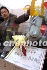 首屆中國(guó)租賃業(yè)推廣展覽會(huì)八日在北京展覽館拉開(kāi)序幕,來(lái)自國(guó)內(nèi)外四十八家企業(yè)及制造商云集一堂。北京一家科技有限公司推出可以寫(xiě)字、拍照、搖獎(jiǎng)的智能機(jī)器人租賃業(yè)務(wù),每日三千元的租賃價(jià)格吸引了不少參觀人員。中新社記者:廖文靜