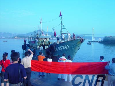 中新網(wǎng)10月11日電 據(jù)中廣網(wǎng)報道,10月11日早晨7點,搭載兩岸三地首次攜手保釣行動10名勇士的“閩龍漁F861”號船安全返回廈門東渡漁港。
