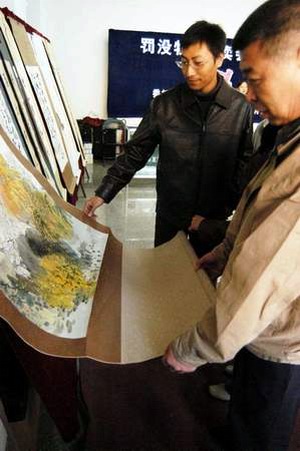 據遼寧省公物拍賣行有限公司債權部經理董茂貴介紹,此次展出的拍品共有9大類、140余件。在展廳的對面,墻上懸掛著的16幅名家書畫特別惹眼,其中“瑞氣繞庭”、“成名何須頑石篆,路上行人口是碑”等幾幅字據說曾是慕綏新比較欣賞的,此時擺在展室里,卻成了對貪官絕好的諷刺。里間的櫥柜里擺放著手表、工藝品、書畫、相機等各種“名牌”貴重物品,很多都是沒有用過的。