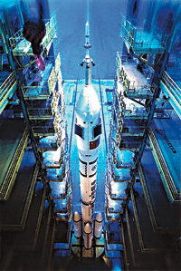 托舉著“神舟”五號載人飛船的“長征”二號F型火箭目前已矗立在酒泉衛(wèi)星發(fā)射中心發(fā)射塔架上,中國首次載人飛船發(fā)射已進(jìn)入倒計(jì)時(shí)。(圖片來源:香港大公報(bào),美聯(lián)社發(fā))