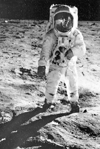 1969年7月20日,美國宇航員尼爾·阿姆斯特朗(頭盔中影像)和巴茲·奧爾德林(如圖)乘“阿波羅”11號飛船首次登上月球。新華社圖