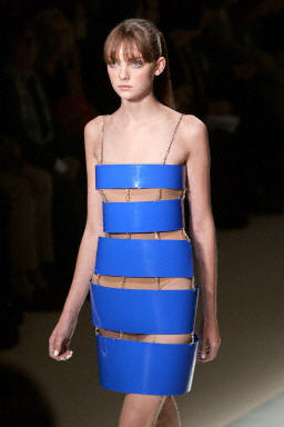 在巴黎2004春夏女裝展上,模特展示了設(shè)計師Paco Rabanne的另類新作。