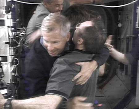 2002年6月7日,美國“奮進(jìn)”號航天飛機(jī)載著幾噸重的補(bǔ)給品、空間建筑材料和來自美、俄、法3個國家的7名機(jī)組人員,成功與國際空間站進(jìn)行了對接。這是“奮進(jìn)”號機(jī)組人員與空間站上的宇航員親切擁抱。新華社圖