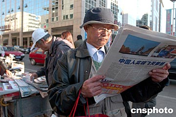 中國第一艘載人飛船“神舟”五號(hào)十五日上午九時(shí)在酒泉衛(wèi)星發(fā)射中心成功發(fā)射升空,北京街頭的市民爭相閱讀有關(guān)報(bào)道。作者:易永明