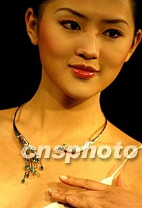 第三屆中國珠寶首飾設(shè)計(jì)大獎(jiǎng)賽十五日在北京揭曉,新絲路名模肖青在頒獎(jiǎng)儀式上展示獲得有色寶石組一等獎(jiǎng)的項(xiàng)飾“風(fēng)姿灼爍”。作品既有華麗的外表,也有精練的內(nèi)涵,雍容高雅,把尊貴和時(shí)尚融入一體。來自中國內(nèi)地、香港、臺(tái)灣等地區(qū)的近兩千件作品參加了比賽。中新社記者:毛建軍