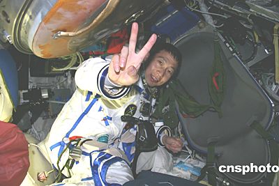 十月十六日晨六時,乘坐“神舟”五號飛船在太空遨游二十一小時的中國航天員楊利偉,披著巡天萬里的征塵,準備從天外歸來。